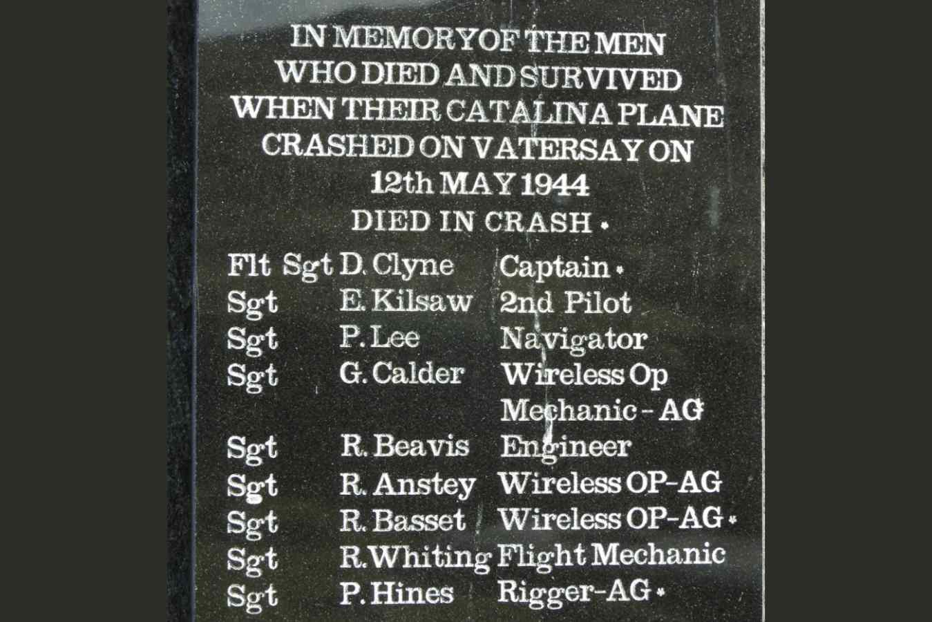 On the Isle of Barra in Scotland, lies the wreckage of a Royal Air Force (RAF) Consolidated Catalina flying boat which crashed during World War II. The plane was on a training flight from Oban on May 1944 when it encountered an unknown problem and ultimately crashed, resulting in the death of 3 out of its 9 crew members.